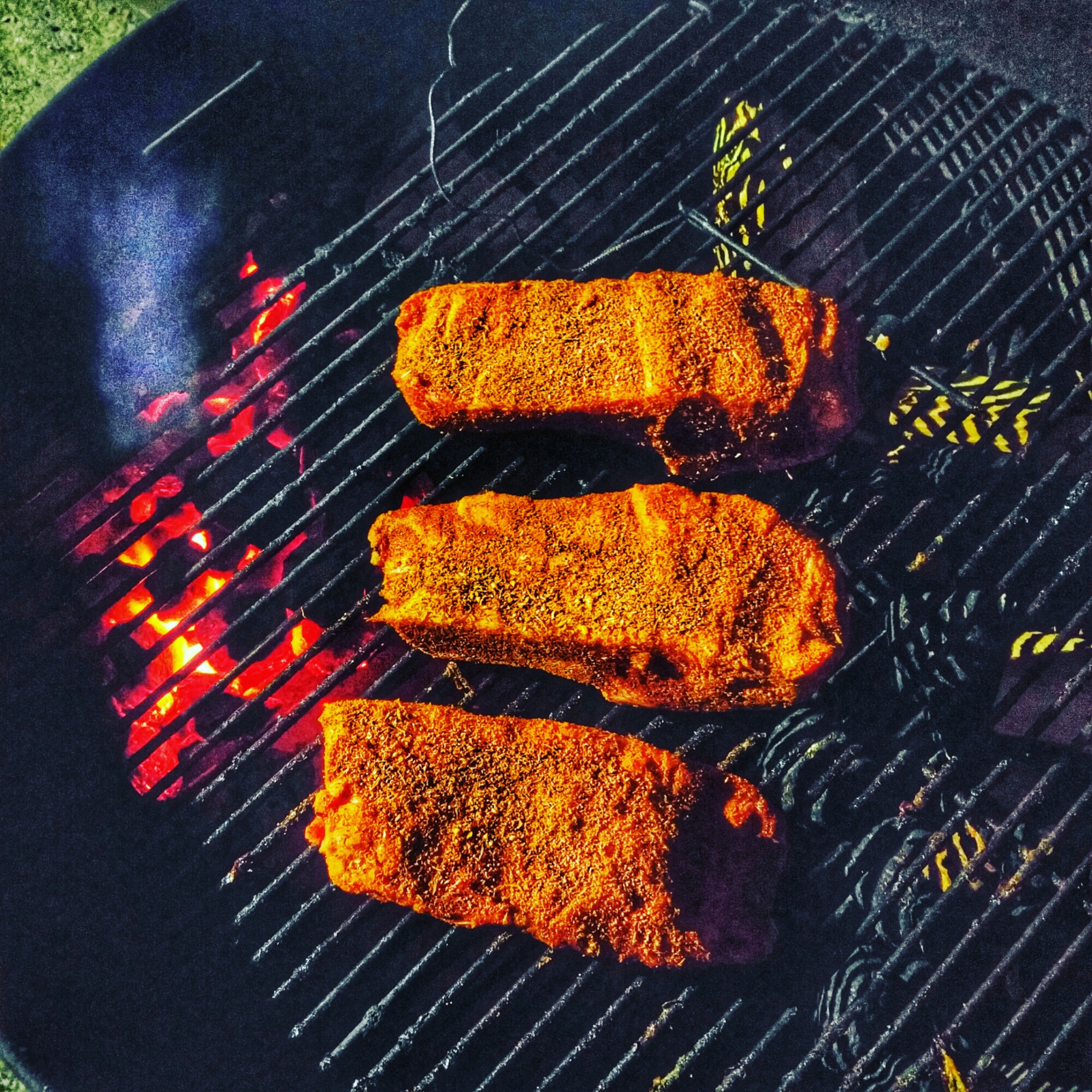 Set up the pit with the coals to one side ( I set up the Weber kettle using the snake method) because I’m smoking some beef ribs at the same time. You’re looking for pit temps of 250-275. Using apple chunks and cherry chips.