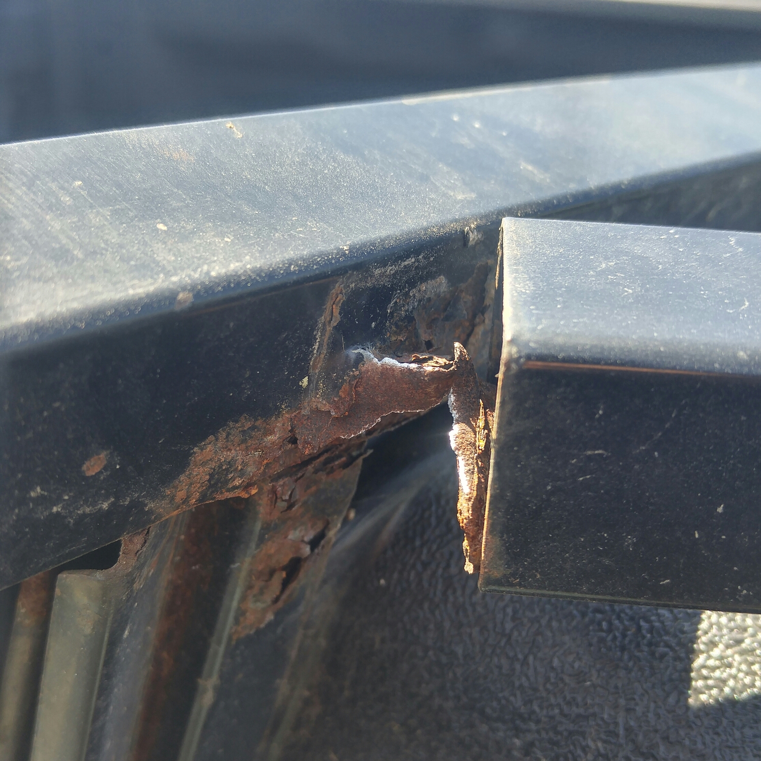 First need to remove the rusted off bolts that secured the Performer’s horizontal cross brace square tubes. Sprayed them with WD-40, put a vice grip on the rusted bolt and another on the nut and with a little pressure they snapped right off, all four of them.