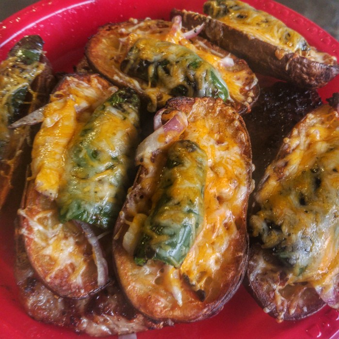 Next place the charred jalapeno halves on the potatos and cover with shredded Mexican cheese. cover and let the cheese melt in.