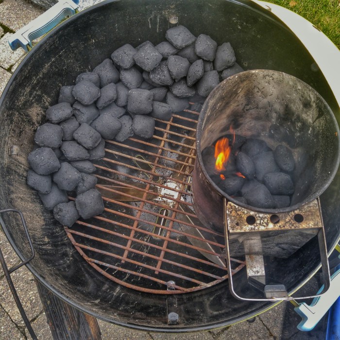 Set up the kettle for snake method cooking where we light about a dozen briquettes and once they are going we put them on the start of the fuse or snake and let the coals work their way around the bowl for a low and slow cook rather than what you’d do with a steak, searing it directly over high heat.