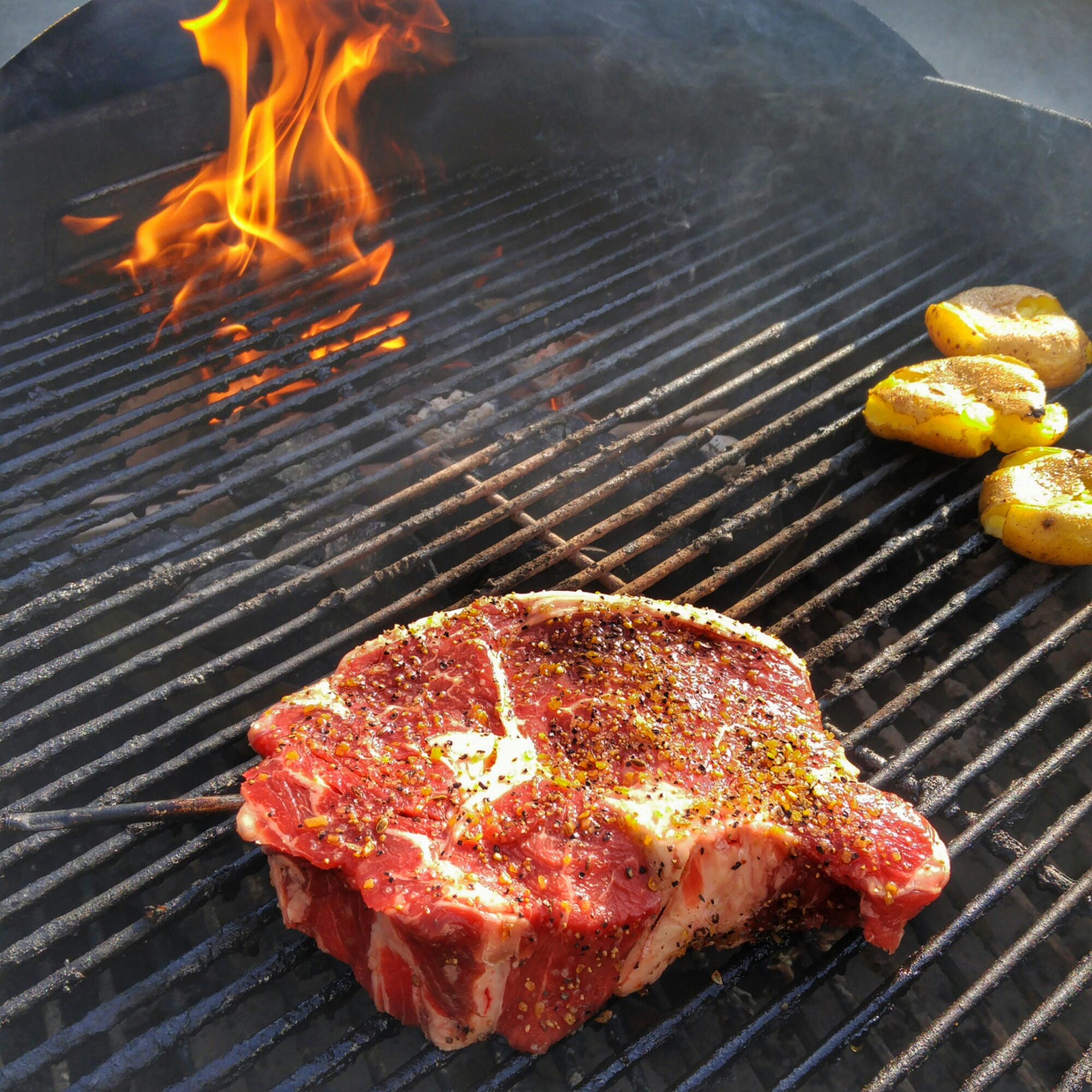 After cooking the onion bacon and smashed potatos using indirect high heat for about a half hour we take the lid off and cook the marinated venison steaks directly over the heat about 3 minutes per side leaving them a medium rare.