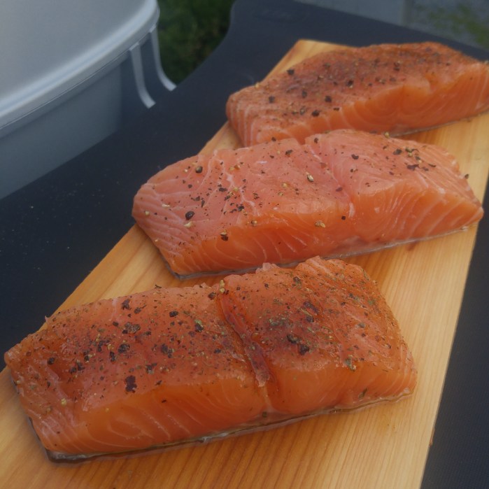 Soak the cedar planks in water for a half hour so they won’t burn. Coat the salmon in EVOO, sprinkle Atlantic Saltworks Coarse Sea Salt, Crushed Black Pepper and on two pieces a maple rub.
