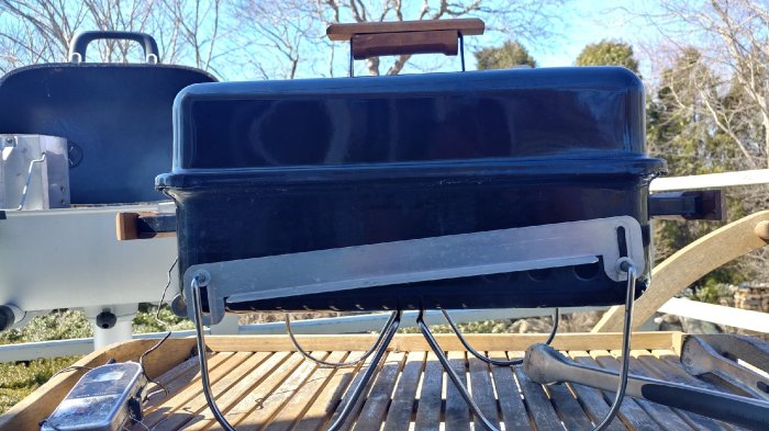 Set up the Weber Go-Anywhere for indirect smoking with a drip pan on one side under the deflector plate slot and 7 or so lit coals in the opposite corner with a bunch of unlit coals.