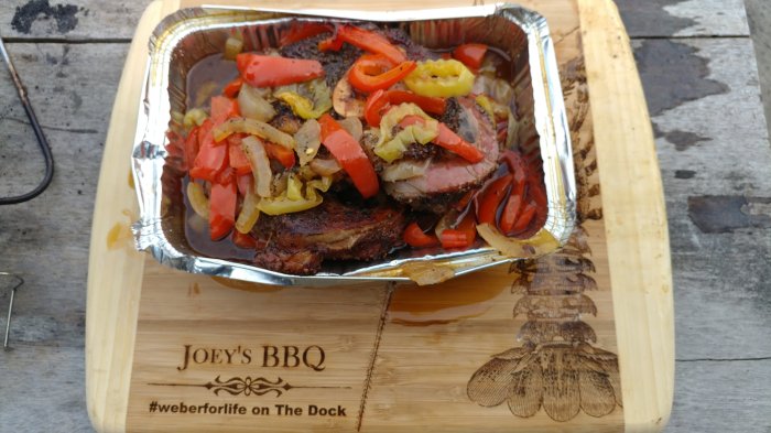 Set up the Weber Go-Anywhere for indirect smoking with a drip pan on one side under the deflector plate slot and 7 or so lit coals in the opposite corner with a bunch of unlit coals.