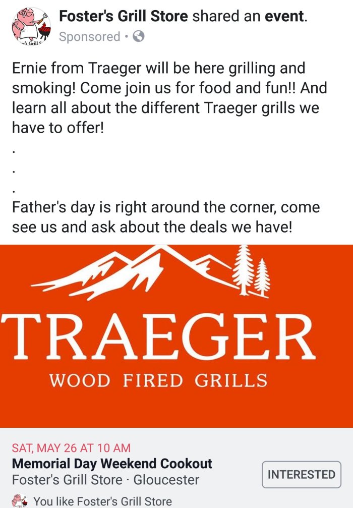 Foster’s Grill Store Traeger Cookout Saturday May 26th 10AM-2PM