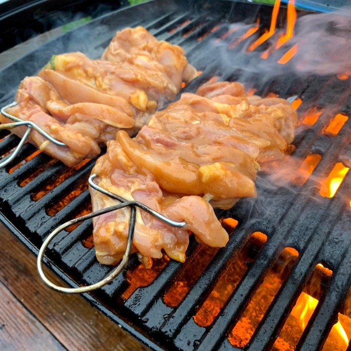 Place charcoal baskets on one side of the kettle, light up 2/3 a chimney of coals and once they’re glowing dump them in the baskets. At this point I’ll toss corn on the cob or russet potatoes offset the coals. I use a chunk of cherry wood or apple, if you want more intense flavors hickory or oak for smoke on top of your coals.