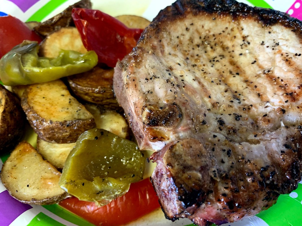 Then I remove the peppers and potatoes from the grill and and direct over the coals grill the bone in pork chops to about 145F (I like them rare and juicy).