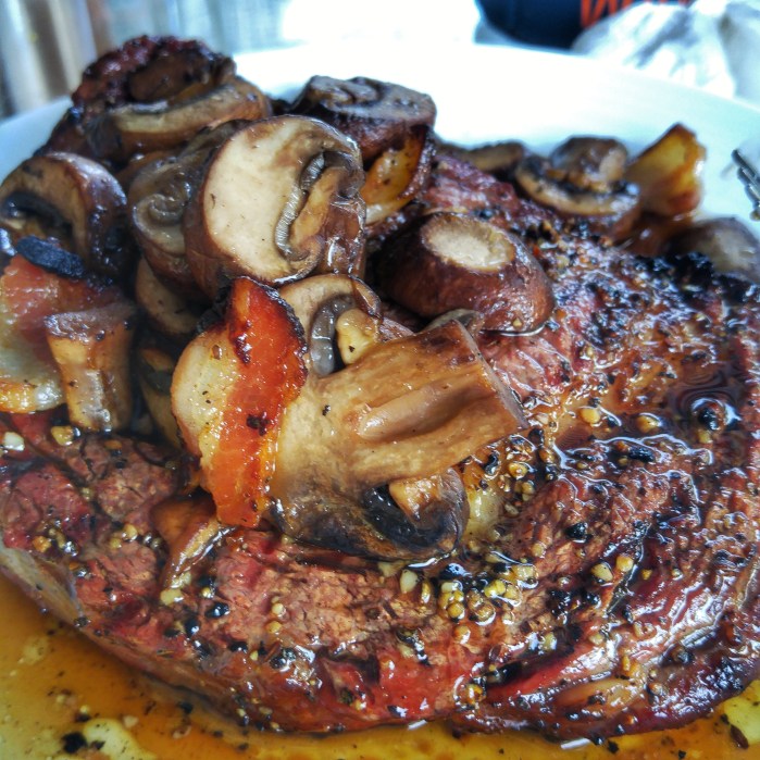 After cooking the onion bacon and smashed potatos using indirect high heat for about a half hour we take the lid off and cook the marinated venison steaks directly over the heat about 3 minutes per side leaving them a medium rare.