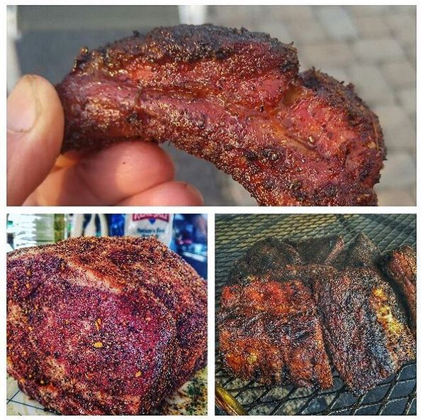 Two hours in I wasn’t satisfied with the color, and the Weber Smokey Mountain had been cruising along at 225. I opened the fuel door and saw quite a bit of charcoal had been used up. Figuring we needed another two hours of heat and looking for a little more heat I fired up 2/3 a chimney of briquettes and added them to the charcoal basket. I also mixed up a container of a couple of tablespoons of Stubbs BBQ sauce, a couple of ounces of apple cider vinegar and a tablespoon of tabasco sauce and spritzed the ribs.