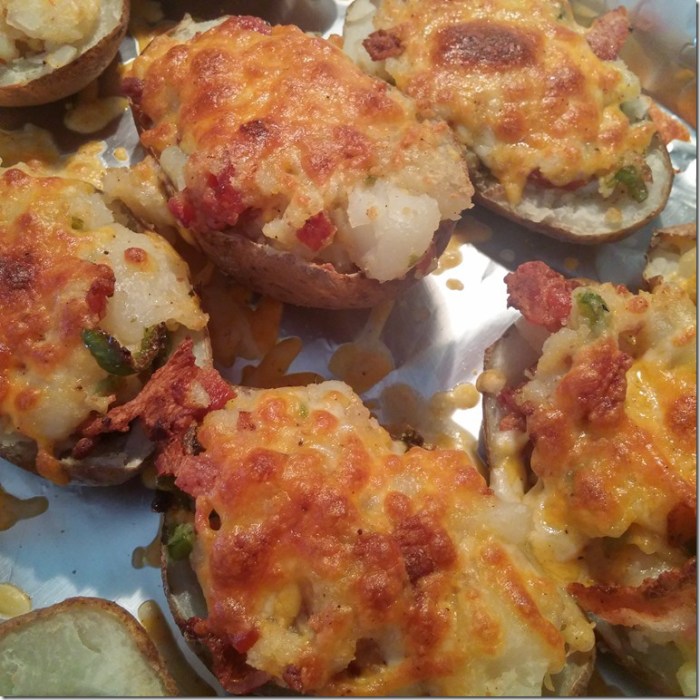 Slice Your Baked Potatoes In Half and scoop the insides out. Mix potato guts into a bowl with your chopped up bacon and jalapenos