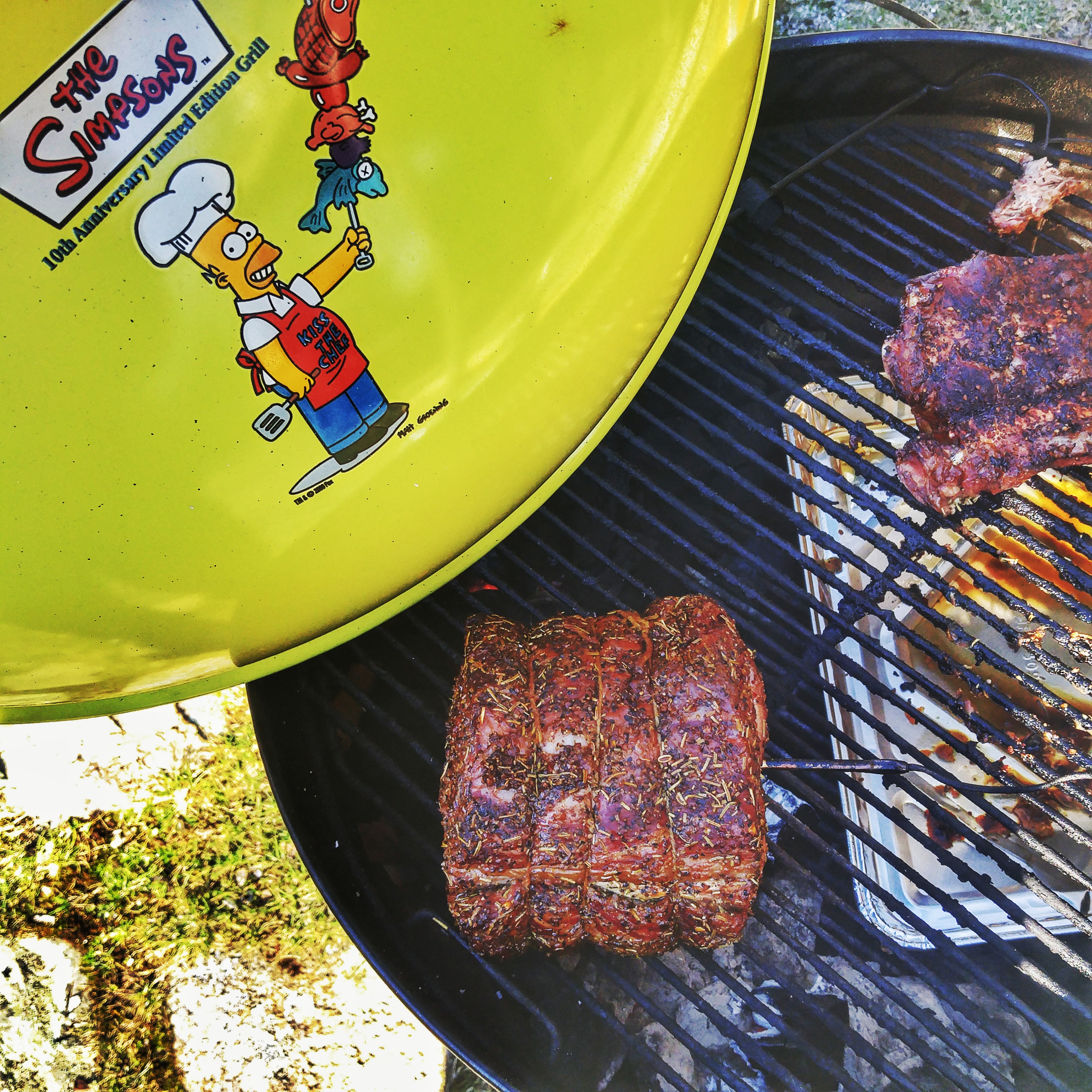 Place the meat opposite the coals, over the drip pan or foil, stick the meat thermometer probe in the thickest part of the roast.
