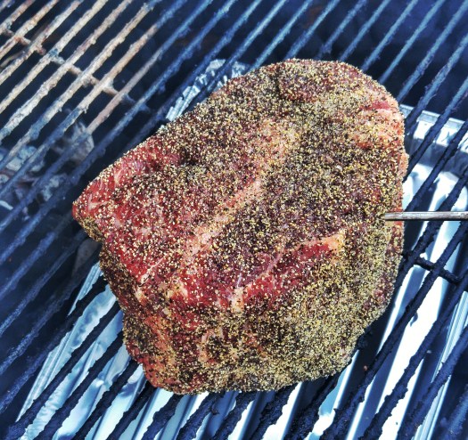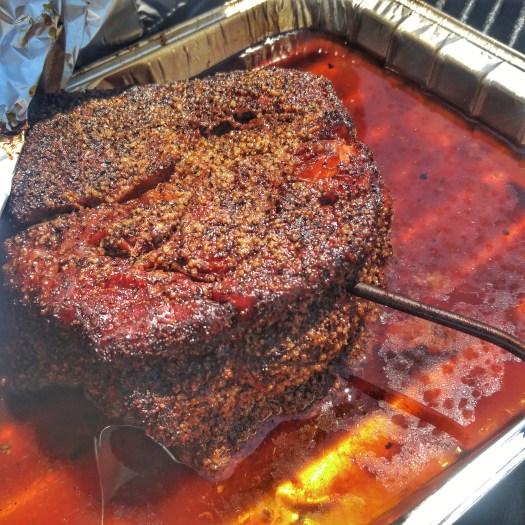 I started at 7:40AM and she was hovering around 225 when I put the two six pound chucks on the opposite side of the grill with foil and foil pans lining the opposite side of the charcoal grate to catch the liquid gold drippings which we’d later reincorporate into the pulled beef.